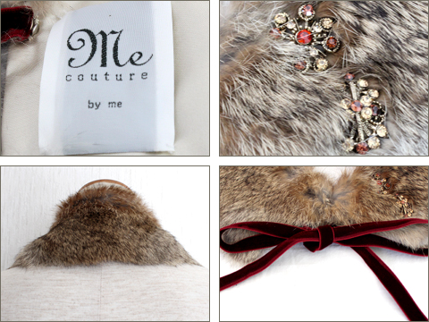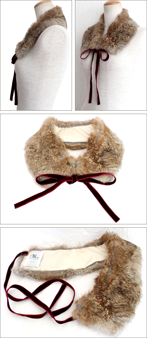 | 素材タグがはがされているため種類は分りませんが、リアルファーです。ファイクファーではございません。フロント1ヶ所ホックでの着脱になります。ブローチとリボンは取り外し可能です。 |
